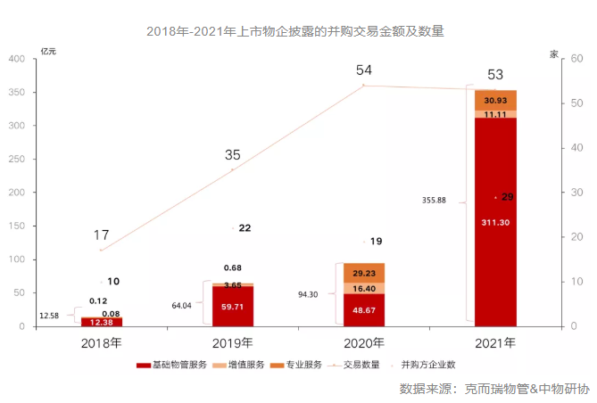 近日,克而瑞物管发布2021年物管行业并购情况总结,去年物管行业并购市场火热,截至2021年12月31日,共有29家上市物企发起53项并购,并购交易总额达355.88亿元。