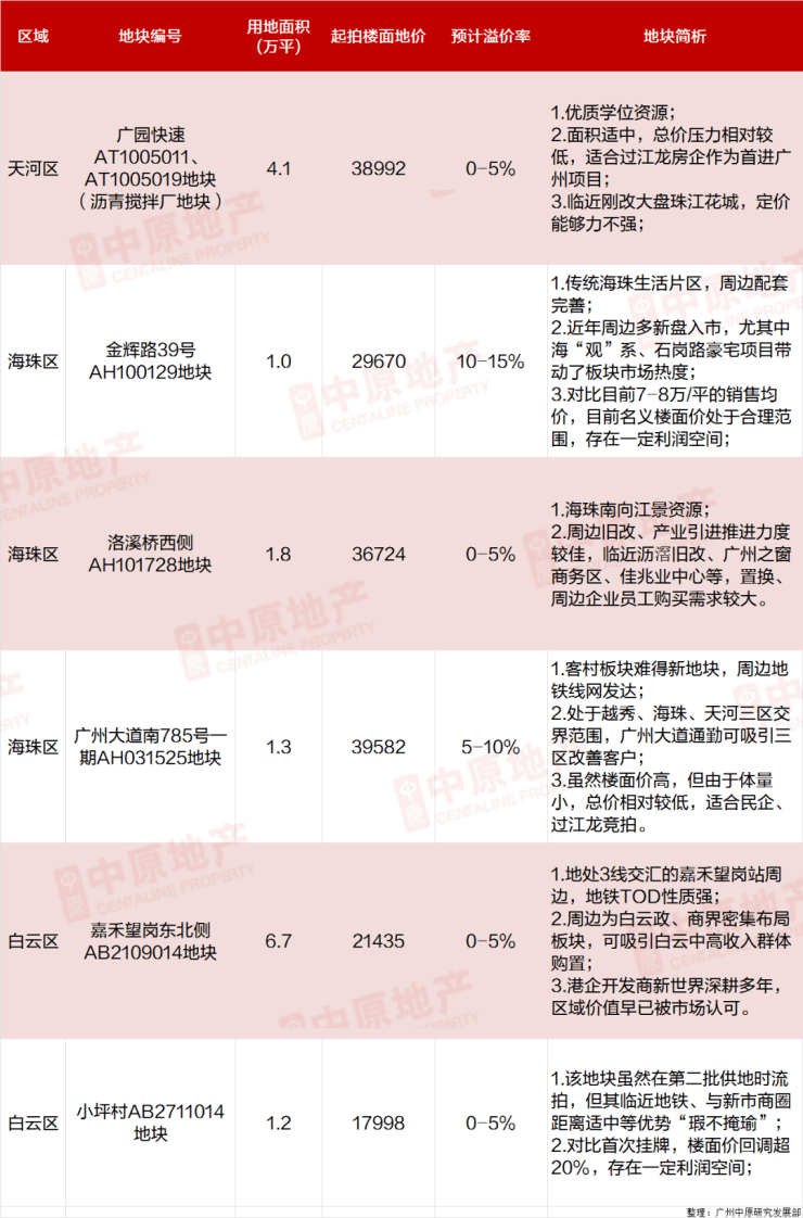 本轮挂牌的20宗商住地,广州中原研发部认为下列6宗地块具有明显市场稀缺性及重要价值;