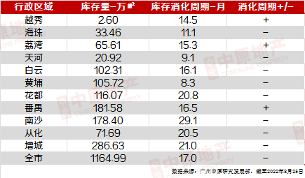 另一方面,根据广州较新库存情况来看,花都、从化、增城等区消化周期已超过20个月;