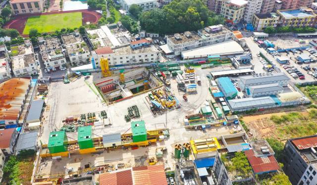黄夏中间风井位于白云区黄石街道石岗村内,周边厂房与居民楼密集分布,且中间风井主体结构尺寸较小,盾构机无法整体下放,施工场地严重受限。