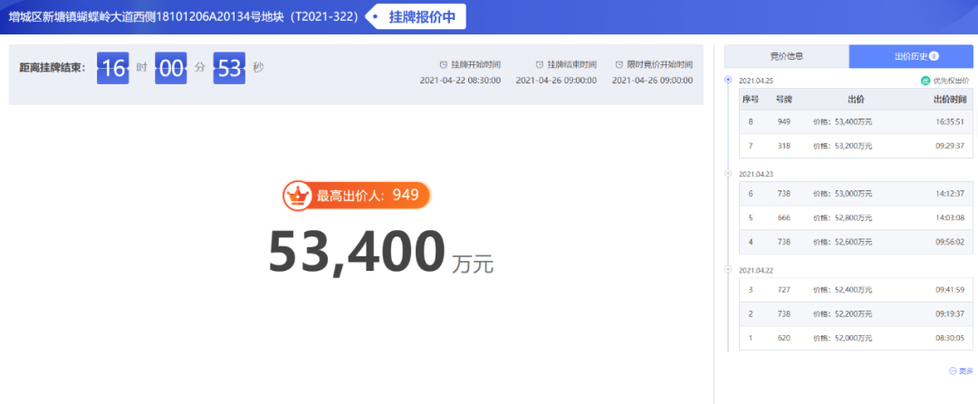 8次报价,溢价4.62%谁会是最后赢家? 目前,报价次数最多的是新塘镇蝴蝶岭大道西侧18101206A20134号地块,截止发稿时,共有8次报价,较高报价为53400万元。