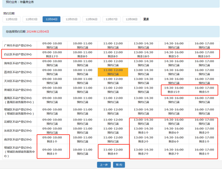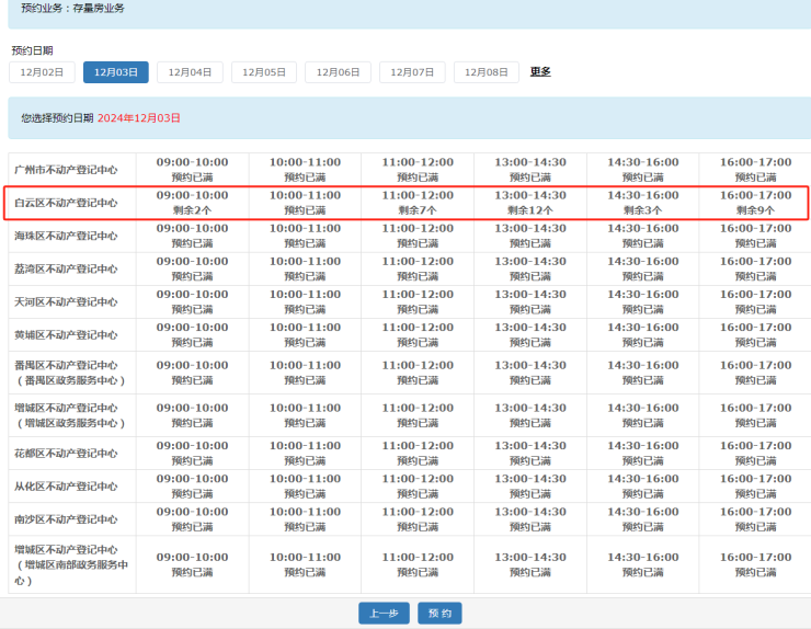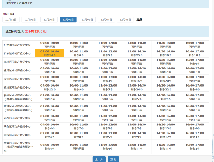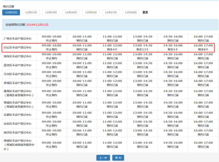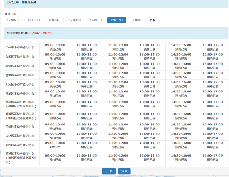 南都湾财社记者在9点30分以后登陆广州市不动产登记网上预约系统,尝试预约存量房交易登记,发现12月2日的网上预约中,除了白云区不动产登记中心尚有11点至下午5点共30个预约号外,其他11个中心均已全部约满。同样,12月3日,也只有白云不动产登记中心尚有余号可以预约,其他11个中心皆已约满。到12月4日,则只有海珠区不动产登记中心、番禺区不动产登记中心(番禺区政策服务中心)、增城区不动产登记中心(增城区政务服务中心)全部预满,别的中心部分时段仍可预约。