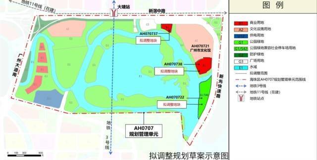项目位于广州市城市新中轴线南段,海珠湖公园东北角,距离地铁3号线大塘站约500米。其中,AH070737地块位于文化馆西侧,AH070738地块位于文化馆南侧,AH070722地块位于AH070738地块以南,新光快速西侧。