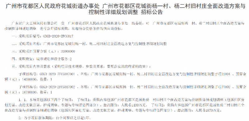 此外,近日花城街杨一村、杨二村旧村庄全面改造方案与控制性详细规划调整在广州市政府采购平台公开招标,括片区策划方案、改造实施方案、控规调整、专题与专项评估四部分,预算金额3300万。