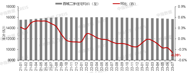 图:2021年1月至2023年7月百城二手住宅价格及环比变化