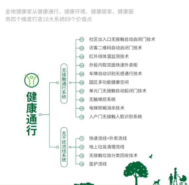 金地健康家,以“智美精工,健康生活”为核心驱动,从健康通行、健康环境、健康居家、健康服务四大维度7大模块打造26大系统109个核心价值点落地。通过改善社区生态、营造健康环境、引导人们建立积极的生活方式,进而满足人们对环境健康、身体健康、心理健康的新需求。