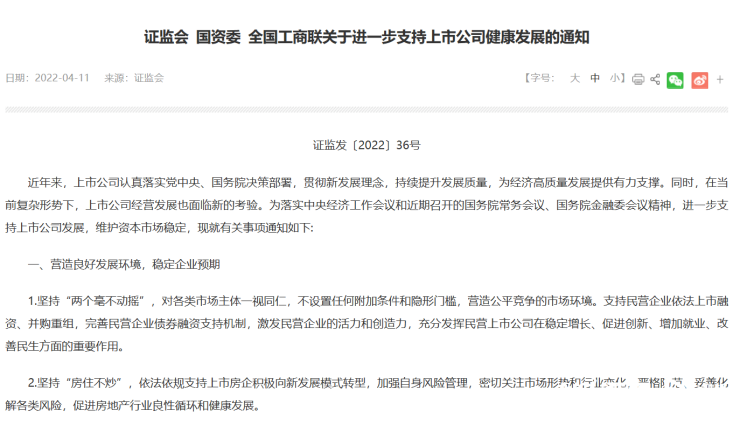为进一步支持上市公司发展,维护资本市场稳定,4月11日,证监会、国资委、全国工商联发布《关于进一步支持上市公司健康发展的通知》指出,营造良好发展环境,稳定企业预期;增进价值回归,稳定投资者预期。