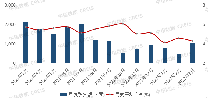 据中指研究院监测,2022年3月房地产企业非银融资总额为1050.7亿元,同比下降50%,环比上升125.4%,自上年10月以来首次单月融资总额突破千亿。行业平均利率为4.27%,同比下降1.46个百分点,较上月下降0.27个百分点。债券审批发行明显提速,信用债和ABS快速回暖是融资总额回升的主要原因。