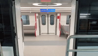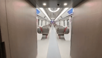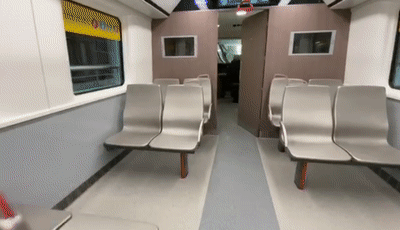 客室内部延续简约现代通透明亮的风格,座椅采用横纵结合布置,深空灰不锈钢座椅搭配地铁红;客室还创新引入了健康照明系统,设置了暖光、自然光、冷光三个档位,当季节不同时,客室照明可实现灯光色温调节,让车厢光线更温馨和人性化。