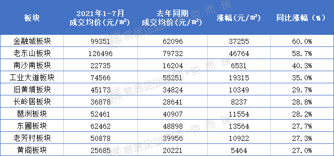 拿下涨幅冠军的还是前面提到的金融城板块,目前板块内多为写字楼产品,一手房不多,板块内在售的佳兆业1号及江源半岛花园已突破10万/㎡,可谓寸土寸金。