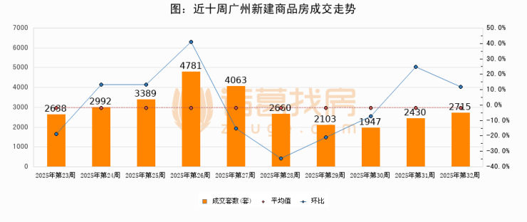 进入2025年第32周(08月04日-08月10日),广州新建商品房成交2715套,较上周增加285套,环比上涨11.7%
