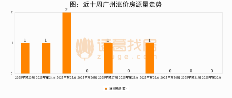 从调价房源来看,第32周广州涨价房源0套,较上周持平。与此同时,32周涨价房源占比持平
