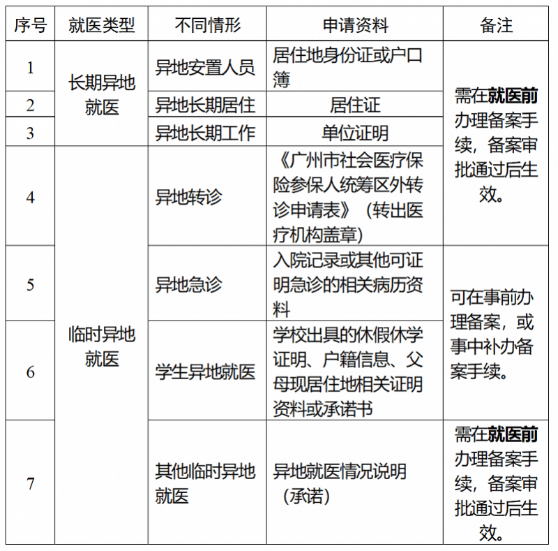 广州参保人办理异地就医备案时需提交的不同材料。图表来自广州市医保局