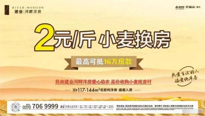 事情的开始是两份网络流传的“另类”海报,在河南省商丘市民权县的建业河畔洋房,可以“2元/斤,小麦换房”;在河南省开封市杞县的建业城,则可以“5元/斤,大蒜换房”。