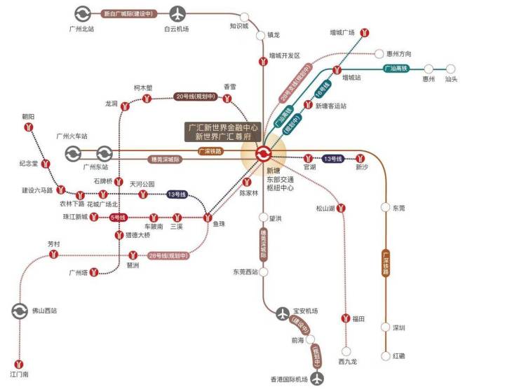 从规划而言,广州东部枢纽地区不仅是大湾区核心城市“穗莞深港” 四城的门户枢纽,也是国内首个集铁路、城际轨道、地铁、汽车客运站等多种公交系统的“枢纽型城市综合体”,汇聚了5地铁+2国铁+2城轨的九大轨道交通,未来可以实现半小时可达广州、东莞主城区,1小时可达深圳主城区。