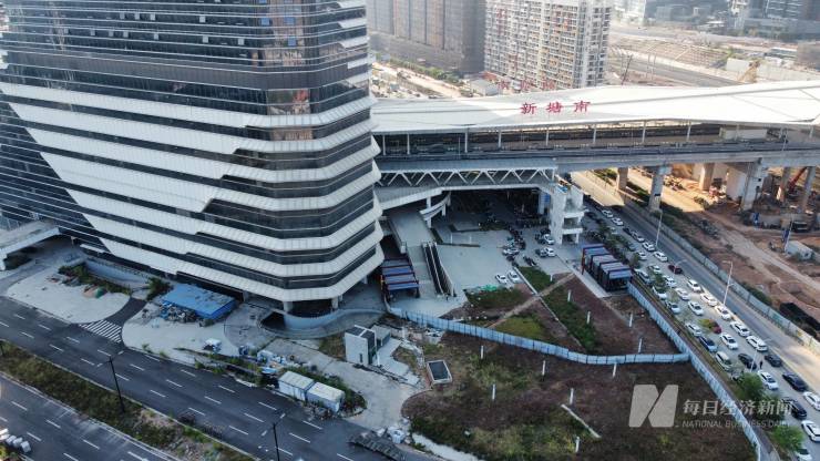 广州珠江新城往东36公里,矗立着两栋200米的超高层塔楼,穗深城际铁轨由南向北从塔楼中间穿过,空中连廊还接驳修建中的广汕高铁新塘站。