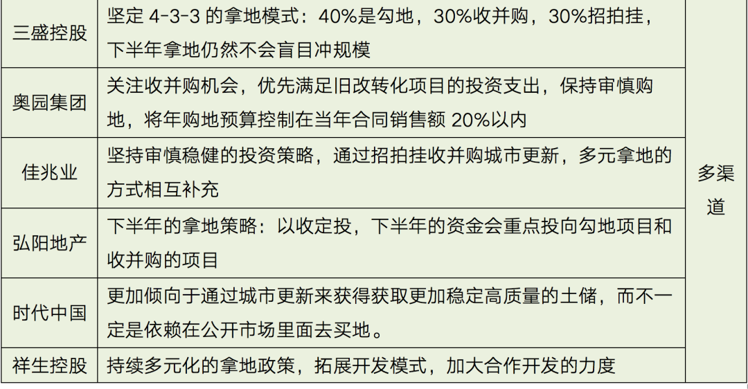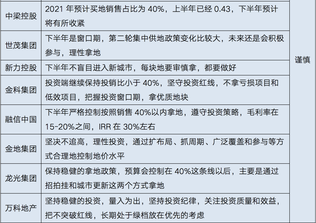 但多数房企仍表示下半年将保持谨慎的投资态度,主要在于控制投资金额与销售金额的比例,以销定投,下半年的投资将与销售牢牢挂钩。例如中梁这样上半年已经积极拿地的房企,由于上半年拿地销售比已经高于0.4,将在下半年收紧投资,以保证全年拿地销售比低于0.4;荣盛也提出将土地款支付额控制在回款额的40%以内,放弃规模,审慎投资。