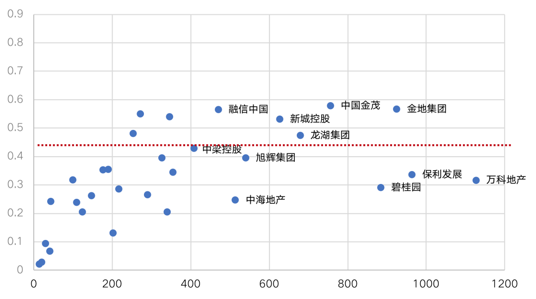 在双集中供地影响下,上半年百强房企平均拿地销售比为0.3,拿地销售比超过0.4的房企占24%,主要以规模较大的国企、央企和区域深耕型的规模房企为主。