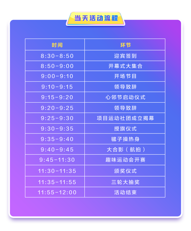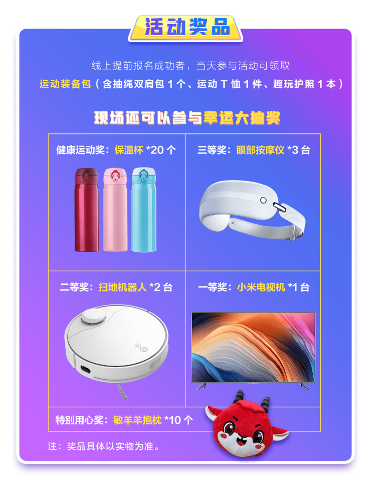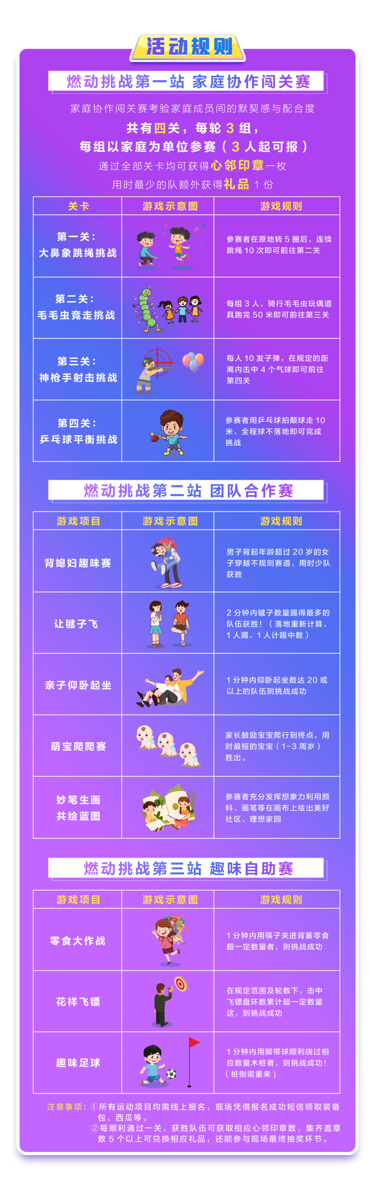 来这里,肆意畅玩,释放青春的活力;来这里,探索健康、绿色生活的独特方式;来这里,尽情享受亲子时光,用运动式陪伴成长;来这里,收获邻里间的亲近与感动,让“陌邻”成“睦邻”;来这里,共同创造一段富有动感、快乐且美好的回忆!此外,现场还有各种精美礼品、奖牌等,惊喜不间断……