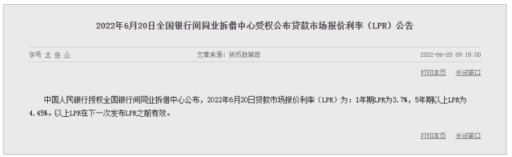 中国人民银行授权全国银行间同业拆借中心公布,2022年6月20日贷款市场报价利率(LPR)为:1年期贷款市场报价利率(LPR)为3.7%,5年期LPR为4.45%,均与上月持平。