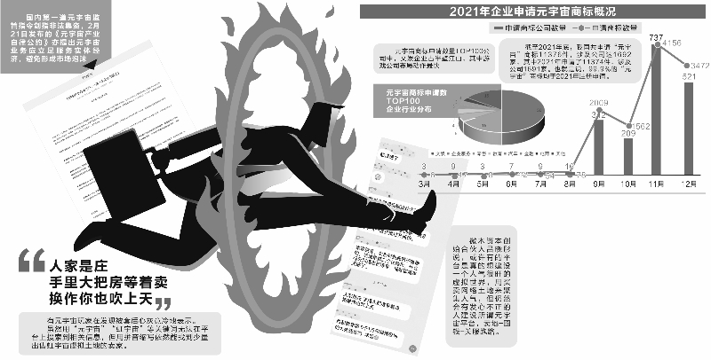 从企业热情看,记者从企查查获得的数据显示,截至2021年底,我国共申请“元宇宙”商标11376件,涉及公司达1692家,其中2021年申请了11374件,涉及公司1691家。也就是说,99.9%的“元宇宙”商标均于2021年注册申请。