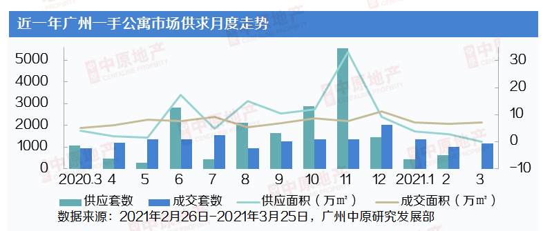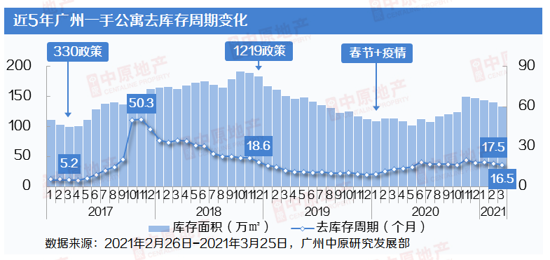 3月广州公寓市场零供应,公寓库存量连续4个月稳步下降至134万㎡,本月末去库存周期下降至16.5个月。