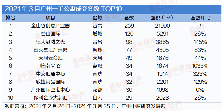 增城区誉山国际1字头双钥匙复式公寓新品销售稳定,以120套的销量位居第二。海珠区越秀星汇海珠湾加推高层47-79㎡的瞰江LOFT公寓,总价160万元起,去化77套。番禺区恒大冠珺之光本月推出75折限时优惠,公寓跑量98套。另外,天河区天河云商汇推出春天集市活动吸客,荔湾区岭南V谷价格调整,这两个项目的销量也有明显上升,挤进榜单第五、六位。