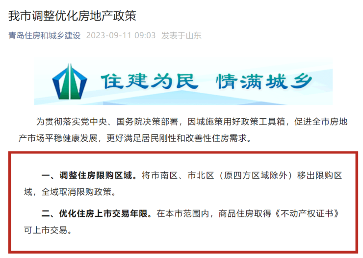 近日,青岛市住房和城乡建设局官微发布《我市调整优化房地产政策》,将市南区、市北区(原四方区域除外)移出限购区域,全域取消限购政策。同日,据媒体报道,济南市从即日起全域取消限购。