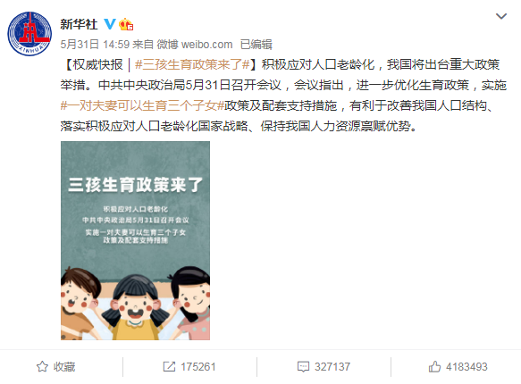 5月31日,中共中央政治局召开会议,强调:”进一步优化生育政策,实施一对夫妻可以生育三个子女政策及配套支持措施。”