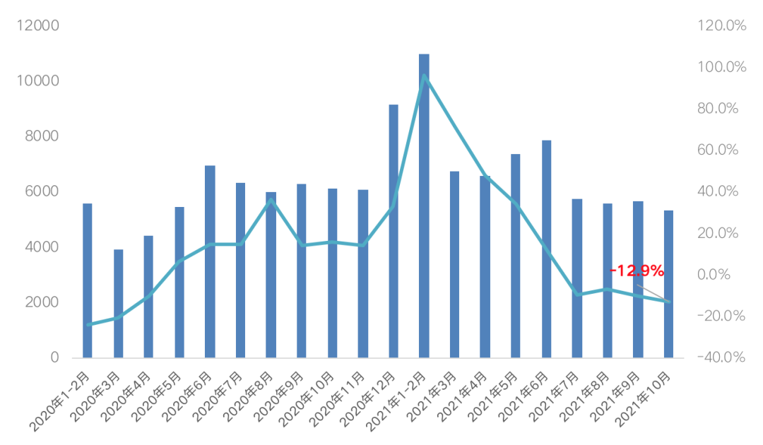 不过目前来看,定金与预收款月度同比增速正在持续走低,2021年10月,定金及预收款新增5351亿元,同比下降12.9%,已降至年内低位。