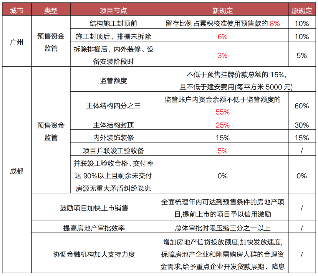 放松对预售资金的监管,调低处于不同工程进度的留存比例,是两大城市政策的共同特征。