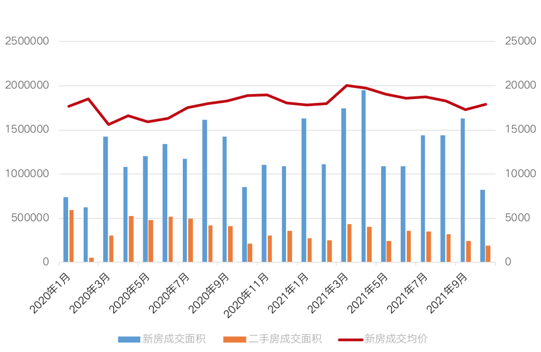 图:2020年以来成都一二手住宅月度成交量及新房成交均价变动情况(单位:万平方米,元/平方米)