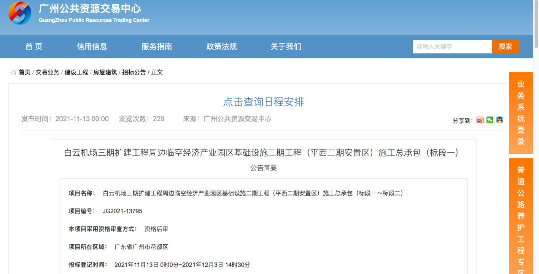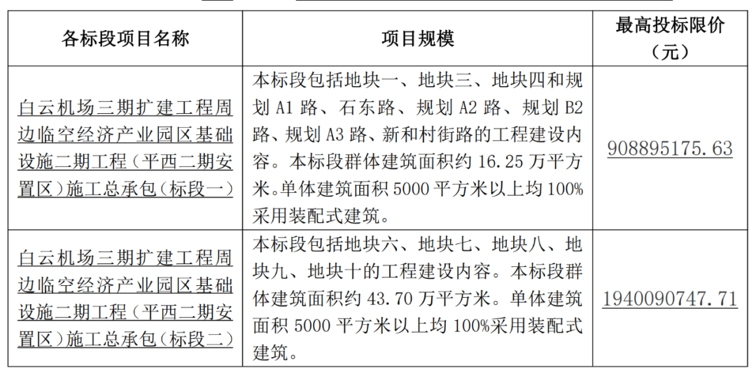 11月13日,广州公共资源交易中心发出白云机场三期扩建工程周边临空经济产业园区基础设施二期工程(平西二期安置区)施工总承包(标段一~标段二)。