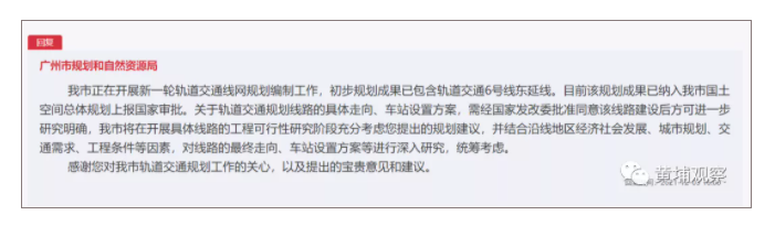 关于规划地铁6号线东延段,近日人民网地方领导留言板上,广州市规划与自然资源局(简称“规自局”)的回复是这样的: