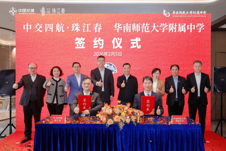 2026 年 2 月 5 日,中交四航・珠江春与华南师范大学附属中学战略合作签约仪式隆重举行。华南师范大学附属中学党委书记、校长姚训琪,华南师范大学附属小学党总支书记张锦庭,广州市黄埔区城市更新局党组书记、局长侯奔,广州市黄埔区黄埔街道党工委书记罗海琼,中交第四航务工程局有限公司副总经理王兆忠,中交四航局总经理助理、投资事业部总经理杨茯苓及珠江春项目代表等共同出席仪式,见证这一里程碑式的合作。