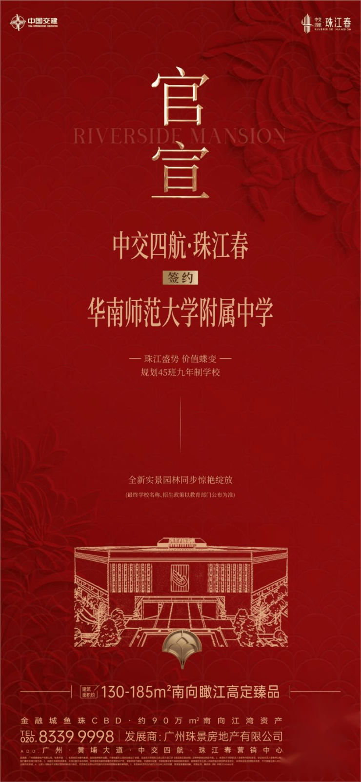 该项目由华南师范大学附属中学与中交四航·珠江春携手打造一所九年制 45 班学校(学校位置与在售地块仅约300 米)。该校将纳入华附教育集团管理体系,由华附统一管理,拓宽育人覆盖面,共享百年积淀的师资、课程等优质教育资源。