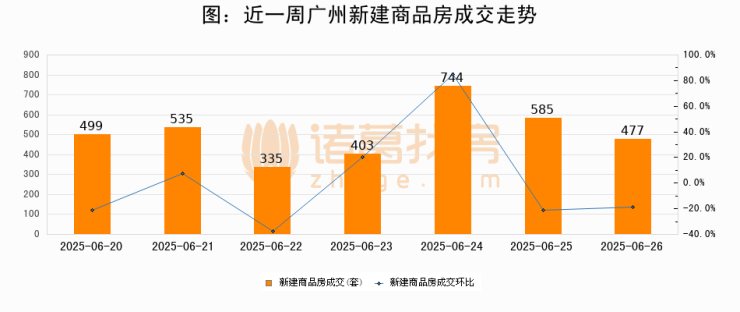 根据广州市住房和城乡建设局数据显示,2025年06月26日广州新建商品房成交477套,较昨日减少108套,环比下降18.5%。近一周广州新建商品房日均成交512套。06月26日单日成交477套,低于近一周平均水平6.8%。