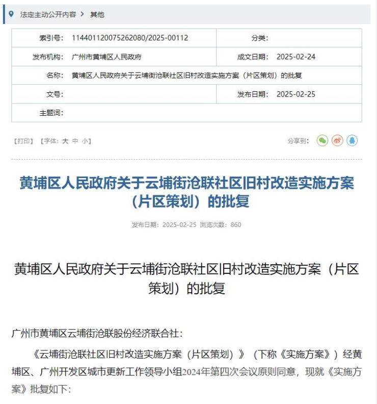 此次批复,同意沧联村旧改采取全面改造方式,以广州市黄埔区云埔街沧联股份经济联合社为改造主体,以合作改造模式开展实施更新改造。