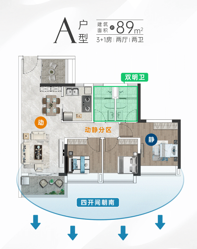 深研理想家庭的居家范本,将每一寸空间妥帖利用,匠造(建面约)89㎡3+1房/112㎡4+1房,两梯四户,稀缺全南向四五房,盛纳理想进阶的舒居梦。