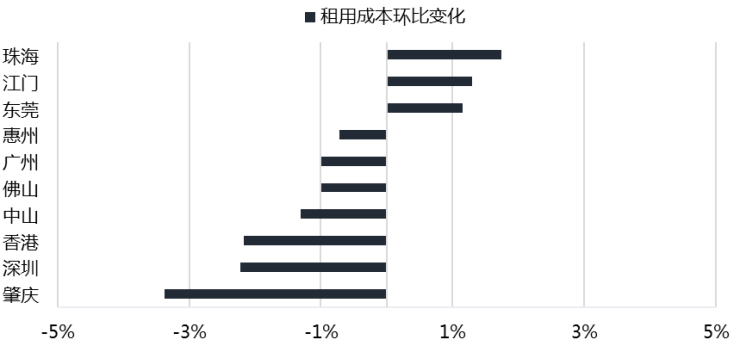 期内,大湾区核心城市如香港、广州和深圳的总租用成本环比跌幅分别为2.2%、2.2%和1.0%。而得益于本地积极的经济发展前景叠加高品质楼宇入市的带动,珠海、江门、东莞三城的总租用成本分别环比增长1.7%、1.3%和1.1%。