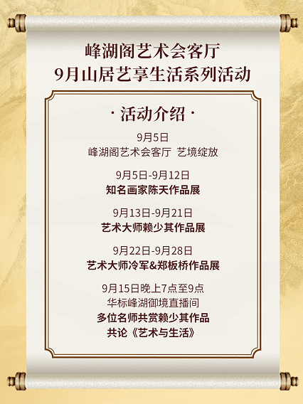 峰湖阁艺术会客厅已荣耀绽放,9月山居艺享生活系列活动正火热进行中,更多书画作品展活动为您奉送,期待与您共赏山水之美。