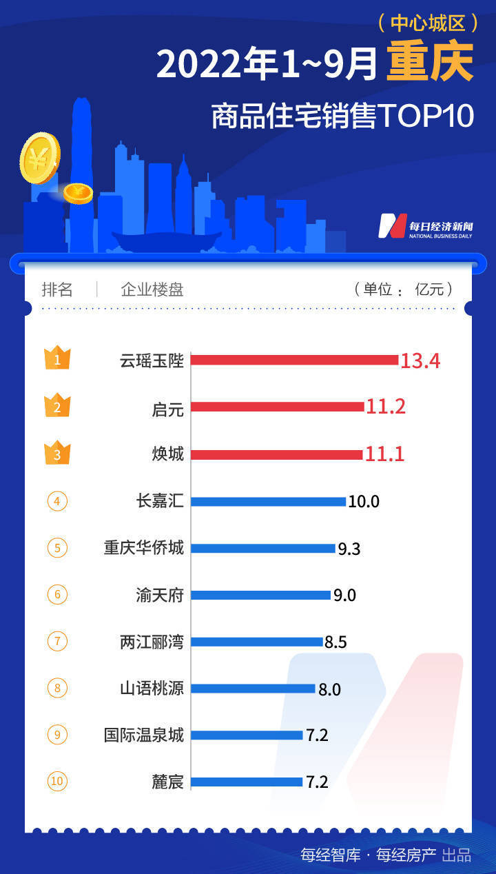 但“金九”未见起色的城市仍有不少,例如省会城市郑州和直辖市天津、重庆,前9个月TOP10项目均不足150亿元,重庆也成为13个城市中销售额较低的城市,仅94.88亿元。