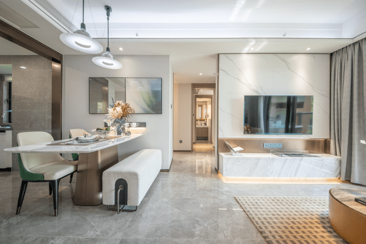 该户型延续了珠江花城一贯的近9成的空间利用率,布局合理动线流畅,最大化减少浪费面积。餐客厅+阳台作为一个公共区域,成为家庭的生活场景中枢,无论是家庭聚餐还是休闲娱乐,都能轻松满足。