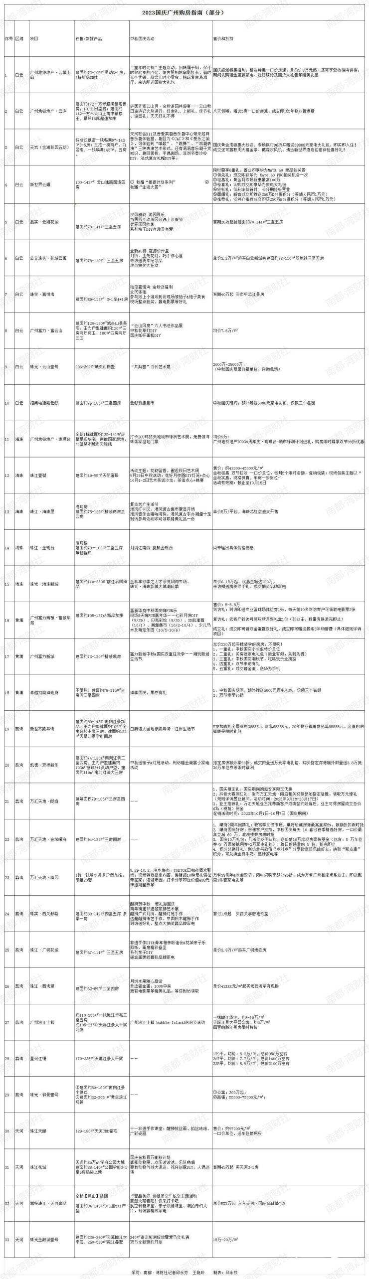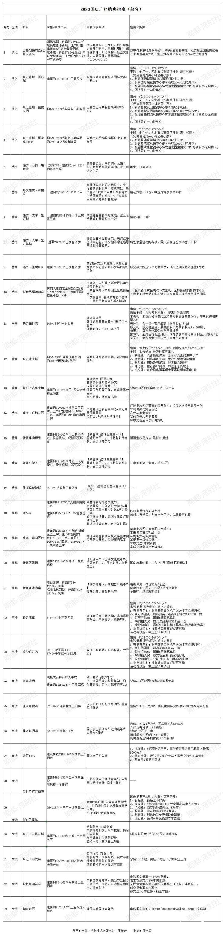 据南都·湾财社记者不完全统计,广州在售楼盘在中秋国庆假期几乎都有或大或小的优惠折扣,除了常规的全民营销奖,一口价单位,购房送物管费等,国企珠实地产推出“首付一成起”无忧购房,白云楼盘最低首付26万元可买;南沙星河畔月湾推出“入伙后再月供”的低成本购房方式(3个名额);在众多楼盘推出9.5折至9.9折之间,从化合景朗悦花园&合景花蔓苑直接推出8折优惠。
