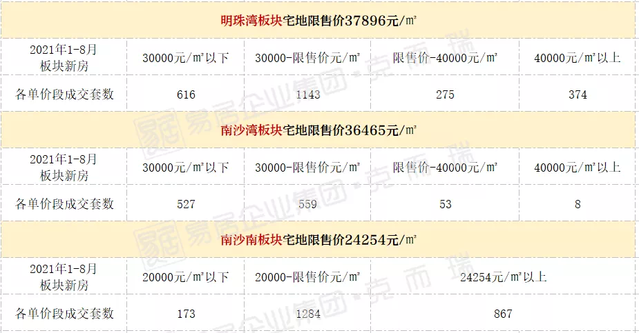 即将在本月底竞拍的南沙区6宗宅地,均要求竞买人在地块项目完成开发对外销售时,首套住房购房家庭(或个人)购房总套数占新建商品住房规划总套数的比例不低于50%;以及限制了各宗地块的房屋销售价格!其中,明珠湾板块(横沥岛)的4宗宅地限房价:37896元/㎡;南沙湾板块1宗宅地限房价:36465元/㎡;南沙南板块珠江街1宗宅地限房价24254元/㎡。而这个限定的售价有什么参考依据呢?小编为各位粉丝仔细对比了今年1-8月以上三板块的新房均价成交划分,从下述三张表清晰可见,以限定售价为参考线,限售价范围内的新房成交网签套数为较高,换而言之,售价几乎代表了目前的周边新房成交价格市场。
