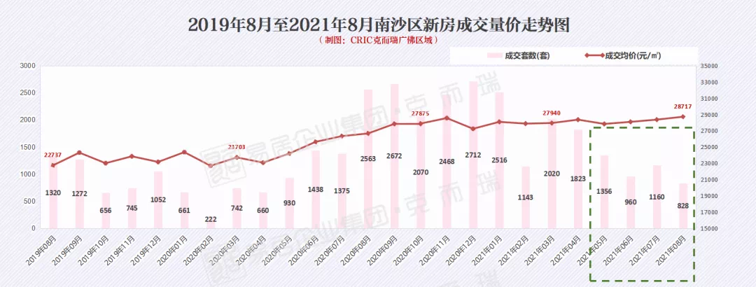 8月份,南沙区新房网签成交828套(口径:普通住宅+别墅),同比减少67.69%,环比减少28.62%;另外,8月该区新房成交均价为28717元/㎡,均价同比上涨7.72%、环比微涨1.26%。要注意的是,区新房成交均价有所上涨,主要是由于8月份网签成交了34套均价4万+/平的一手房,拉高了平均值。克而瑞市场监测到,原本在4月份广州楼市调控,要求严审购房资格、首付资金来源后,南沙区楼市就逐渐进入冷却状态,不复2020年下半年的火热;而在半个月前8月17日南沙区正式发文:取消“2+1”政策,即南沙区购房纳入广州限购范围,致使该区新房成交量再次走低。