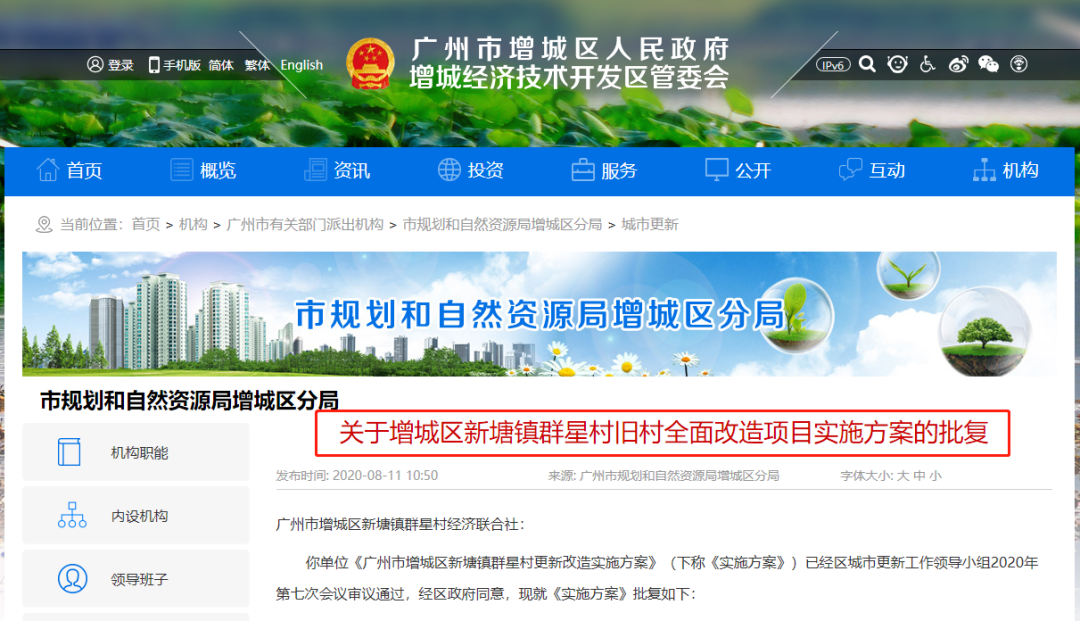 就在8月11日,增城区政府门户网站公布了关于新塘镇群星全面改造项目实施方案的批复!