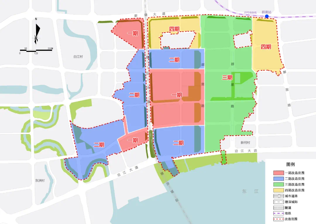 ●项目分四期实施改造。优先建设复建安置区及公配设施。