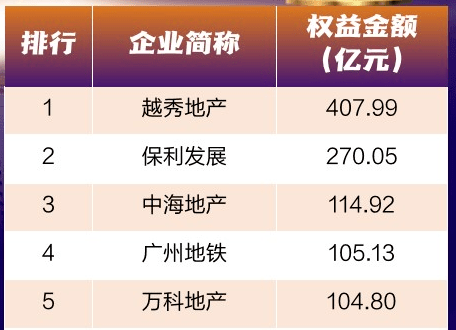 从权益金额规模看,今年前11月TOP5房企率先迈入百亿阵容,分别为越秀、保利、中海、广州地铁、万科。值得一提的是,这五家房企在去年同期也已取得破百亿业绩,彼时百亿队伍里还有时代中国、中国恒大两家房企。