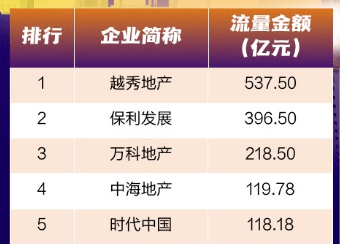 而流量金额维度,同样是TOP5房企业绩突破百亿,分别是越秀、保利、万科、中海、时代。与权益榜稍有不同的是,广州地铁由于操盘项目不多,所以并未出现在流量金额TOP30排行上。